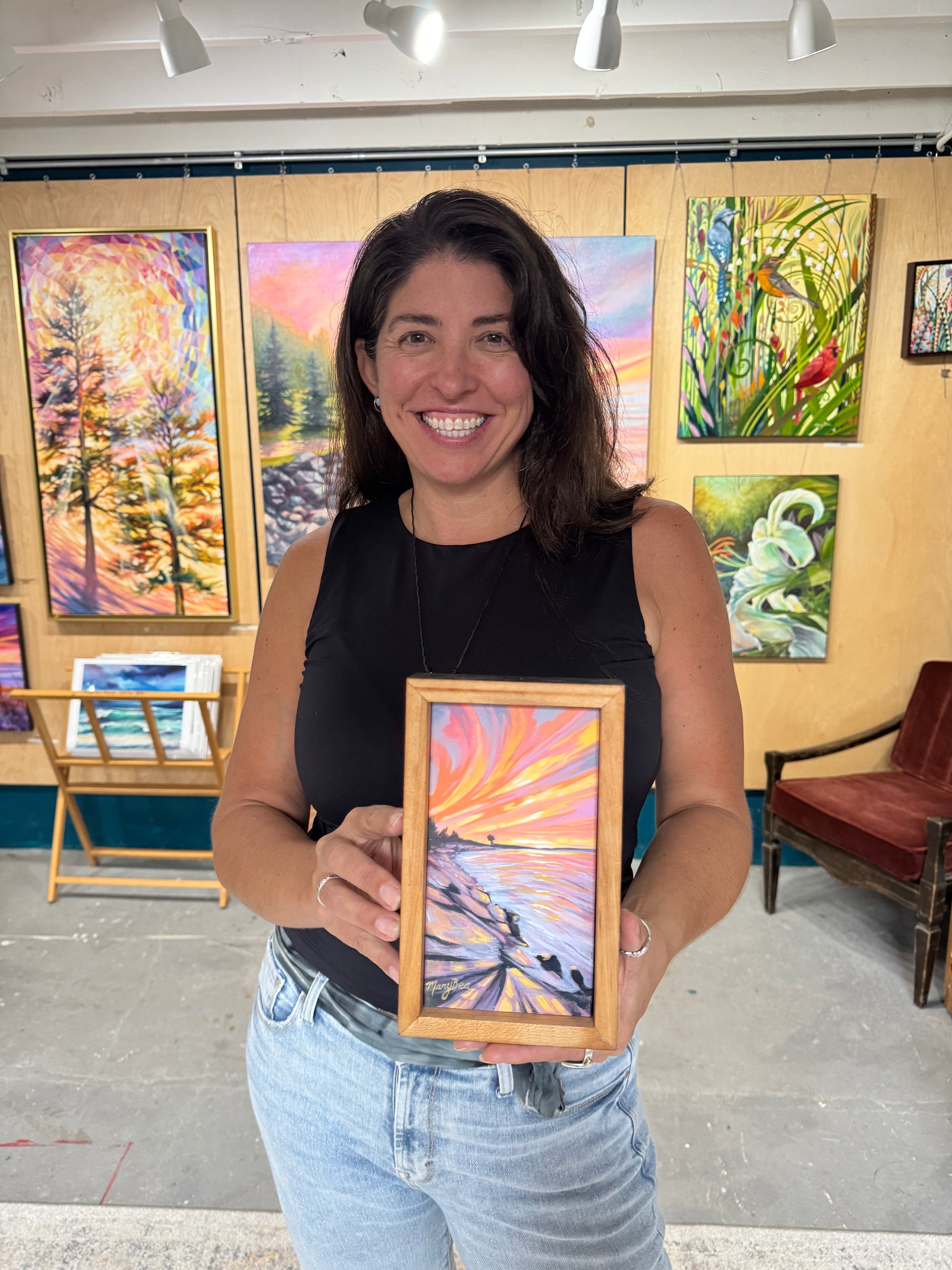 This cute painting captures a Petoskey sunset in all its glory. From the glowing shoreline to the unique wood frame, this painting is one of a kind! This original painting was created in the summer of 2023. The Painting is acrylic on wood panel, with a clear finish applied. The wood frame is made by Urban Ashes, an up-cycling project that uses wood from abandoned buildings.