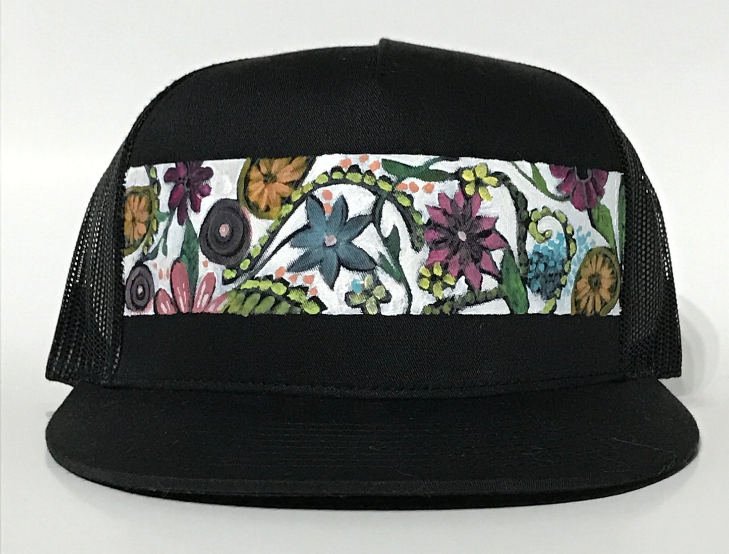 "flowers" Hand Painted on Black Snapback Fabric Back Hat