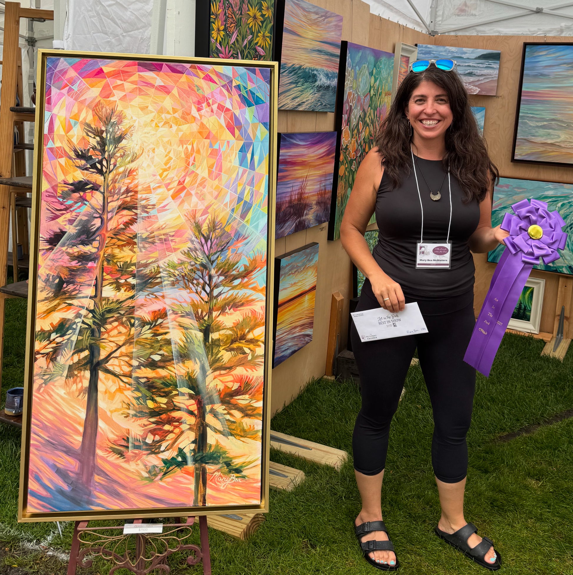 "Golden Rays" was painted in summer of 2025. Filled with radiant fractals of prismatic light, "Golden Rays" is an instant favorite. This painting offers a light, warmth, and wonder that reach far beyond the canvas. “Golden Rays” is an original acrylic on canvas, with a clear protective finish applied, and includes a slim gold floater frame.