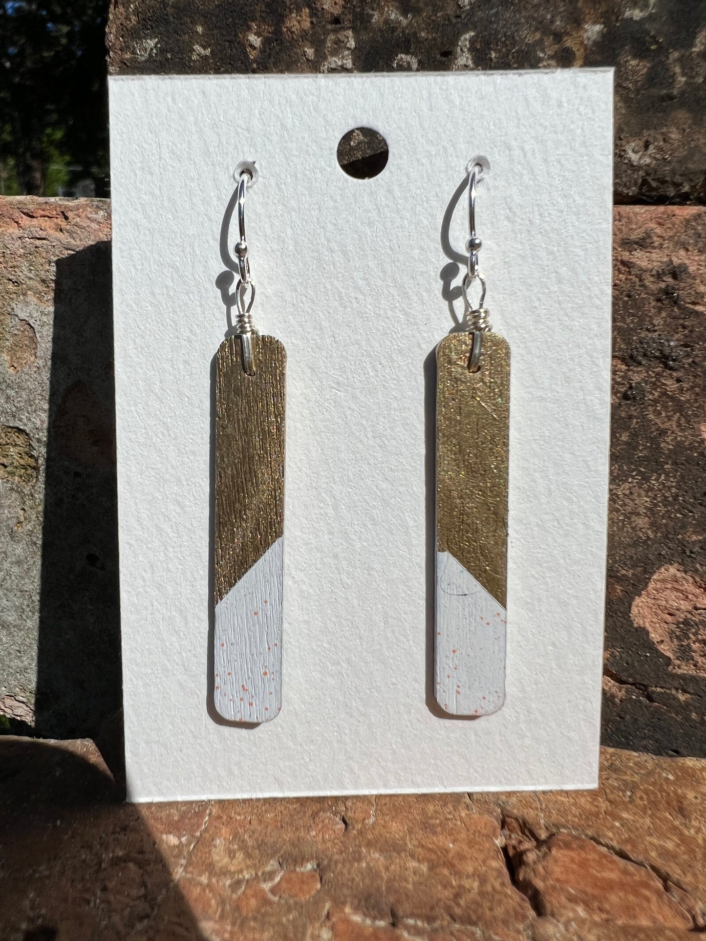 This pair of Mary Bea Art hand painted earrings is completely unique. They are hand crafted by the artist from painted birchwood, sterling silver, and 14k gold. They are durable, comfortable, non-allergenic, and lightweight. Enjoy this piece of wearable art for years to come.