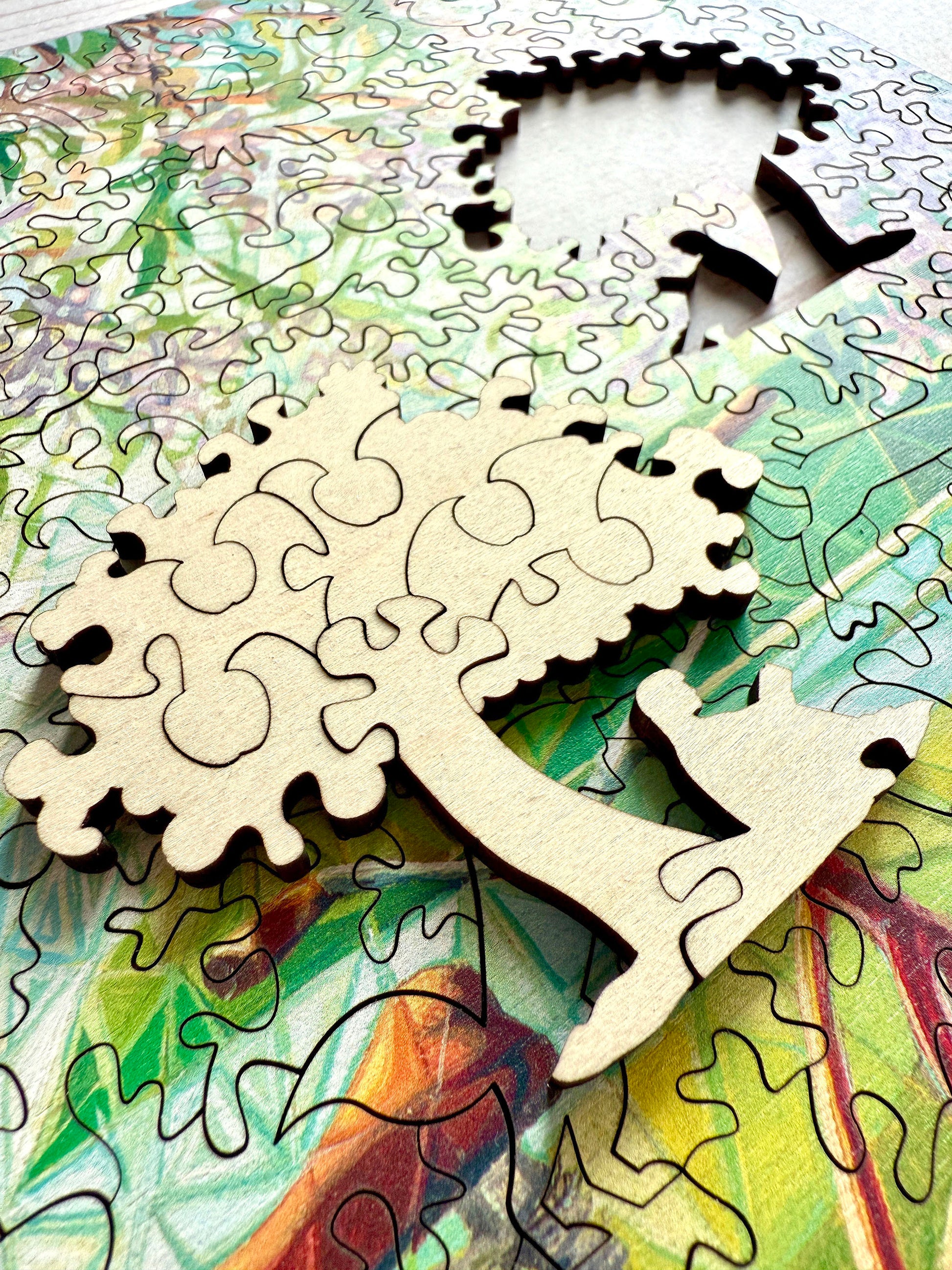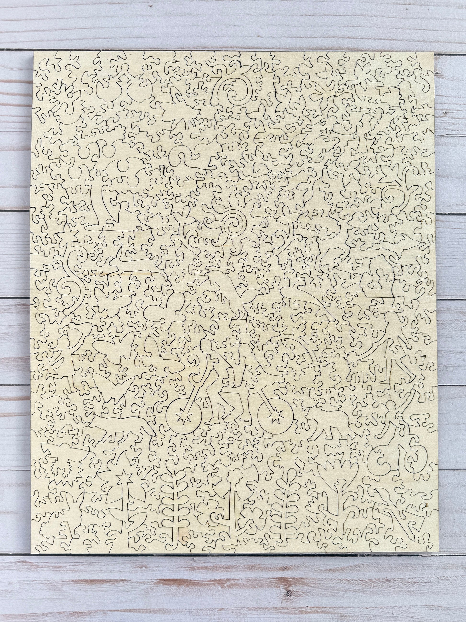 Every puzzle is laser-cut from premium wood, featuring unique interlocking shapes and playful whimsy pieces that echo the spirit of the artwork. In this design, you’ll discover a tandem bicycle, wildflowers, and dozens of other surprising shapes hidden among the pieces, each one waiting to be found.