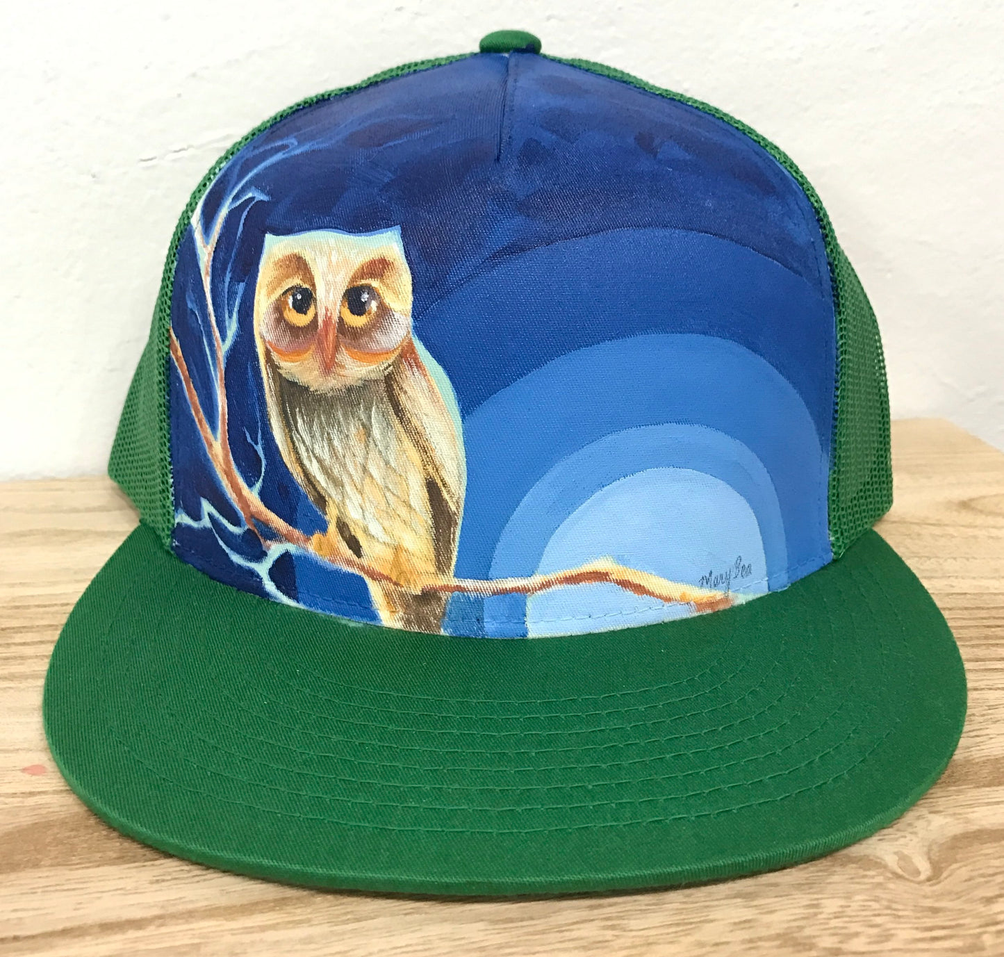 "Owl" Hand Painted on Green Snapback trucker Hat