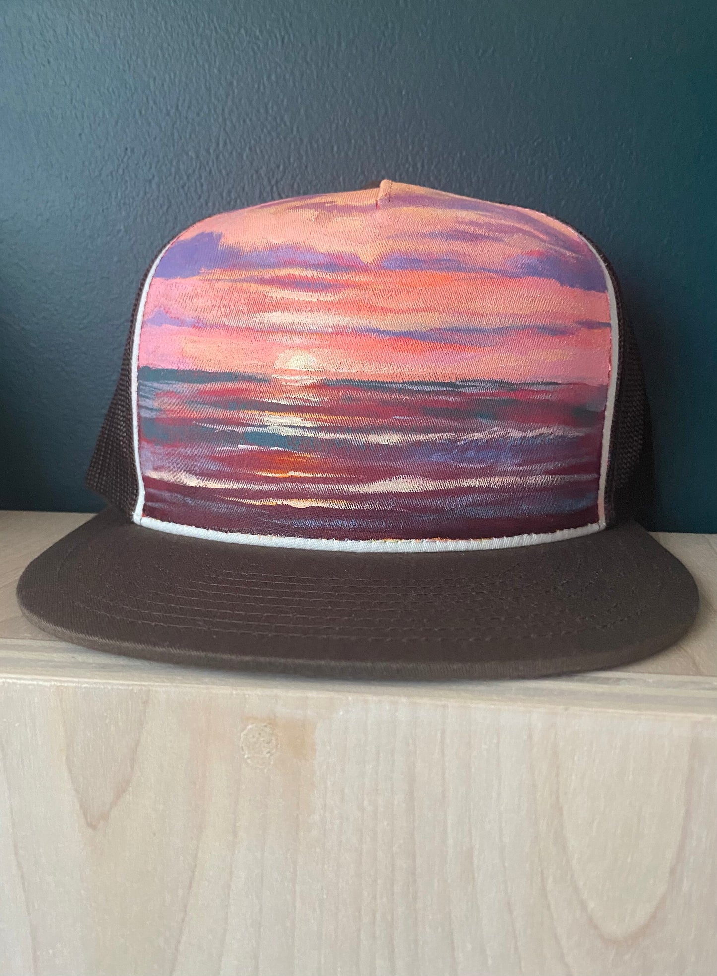 This hand painted, wearable, and washable hat is one-of-a-kind. One size fits most, and the back features an adjustable snapback and “Mary Bea Art” stitched tag. The artwork is durable and will last the life of the hat.